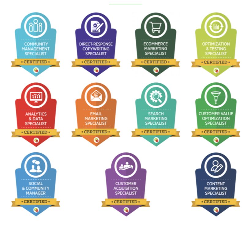 I have earned four out of the eleven certifications offered by Digital Marketer shown below. Optimization & Testing, Analytics & Data, Customer Acquisition, and Content Marketing. The plan is to attain all eleven certifications for my own benefit and for the benefit of all current & future clients.